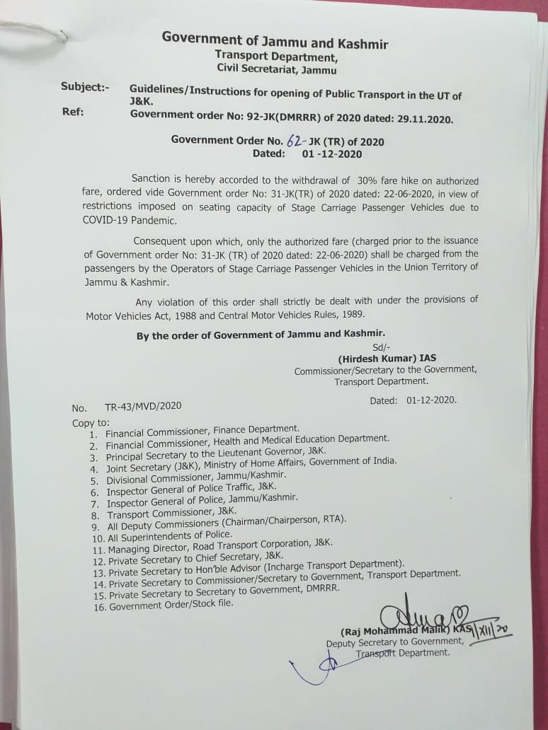 Jammu | 01-Dec: In a decision taken by the State Transport Department it has been said that sanction is accorded to the withdrawal of 30% fare hike on authorized fare, ordered vide Government order No. 31-JK(TR) of 2020 dated 22-06-2020, in view of restrictions imposed on seating capacity of Stage Carriage Passenger Vehicles due to COVID-19 Pandemic.