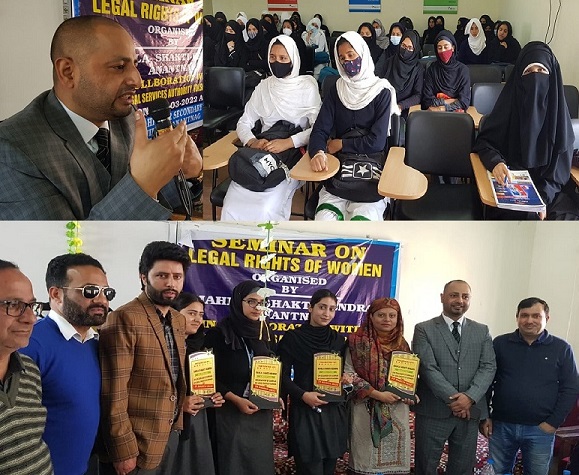 Anantnag, March 25: Mahila Shakti Kendra (MSK) Anantnag in collaboration with District Legal Services Authority Anantnag today organised a one day seminar on Legal Rights of Women at Govt Higher Secondary School Ranibagh, here.