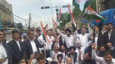 All executive members of Bar Association and senior lawyers urged upon the administration to immediately resolve all the genuine demands of the legal fraternity viz. construction of multi storey building for housing all the judicial work i.e. Registration work, CAT, DRT, AFT and other Tribunals within the court premises Earlier a large number of lawyers assembled in the District Court Complex and marched towards High Court Road Chowk holding ‘Tricolour’ in hands and chanting slogans in support of their demands.