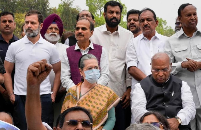 Congress Parliamentary Party chairperson Sonia Gandhi, Congress president and leader of opposition in Rajya Sabha Mallikarjun Kharge and party leader Rahul Gandhi were present during the protest.