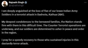 “I am deeply anguished at the loss of five of our brave Indian Army soldiers in a terrorist attack in Badnota, Kathua (J&K),” the defence minister said on X.
