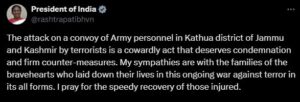 Taking to micro-blogging site X the President Murmu said: “The attack on a convoy of Army personnel in Kathua district of Jammu and Kashmir by terrorists is a cowardly act that deserves condemnation and firm counter-measures. My sympathies are with the families of the bravehearts who laid down their lives in this ongoing war against terror in its all forms. I pray for the speedy recovery of those injured.”