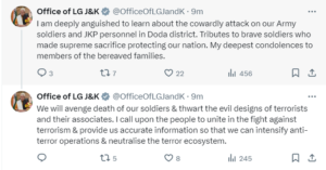 In a post on X, Sinha said, “We will avenge death of our soldiers & thwart the evil designs of terrorists and their associates. I call upon the people to unite in the fight against terrorism & provide us accurate information so that we can intensify anti-terror operations & neutralise the terror ecosystem”.
